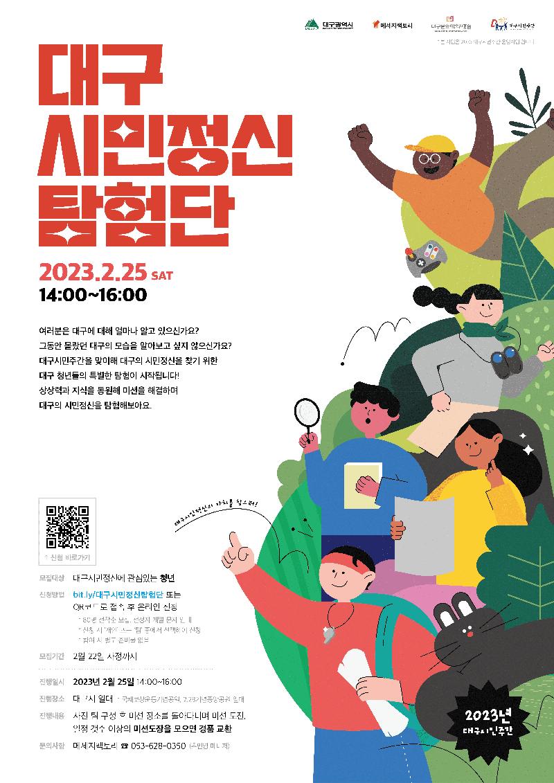 2023년 대구시민주간을 맞아 상상력과 지식을 동원해 미션을 해결하며 대구의 시민정신을 탐험해볼 <대구시민정신 탐험단>을 모집합니다!
