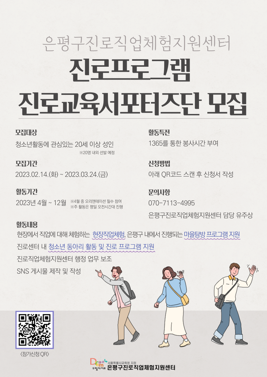 은평구진로직업체험지원센터에서 현장직업체험, 마을탐방프로그램 등 청소년 대상으로 진행되는 진로프로그램 운영을 함께할 진로교육서포터즈단을 모집합니다! 주 활동 내용은 청소년 인솔, 청소년지도인력 보조 등입니다. 활동은 봉사자가 가능한 날짜와 시간에만 참여하면 되며, 적극적인 참여를 권장합니다. 활동 내용은 봉사자의 역량에 따라 협의 후 진행되오니 관심 있는 분들의 많은 참여 부탁드립니다!! ※가입방법 : QR코드 스캔 또는 아래 링크 클릭 <https://naver.me/G7DnqUhd> 문의사항 : 070-7113-4995 은평구진로직업체험지원센터 유주상
