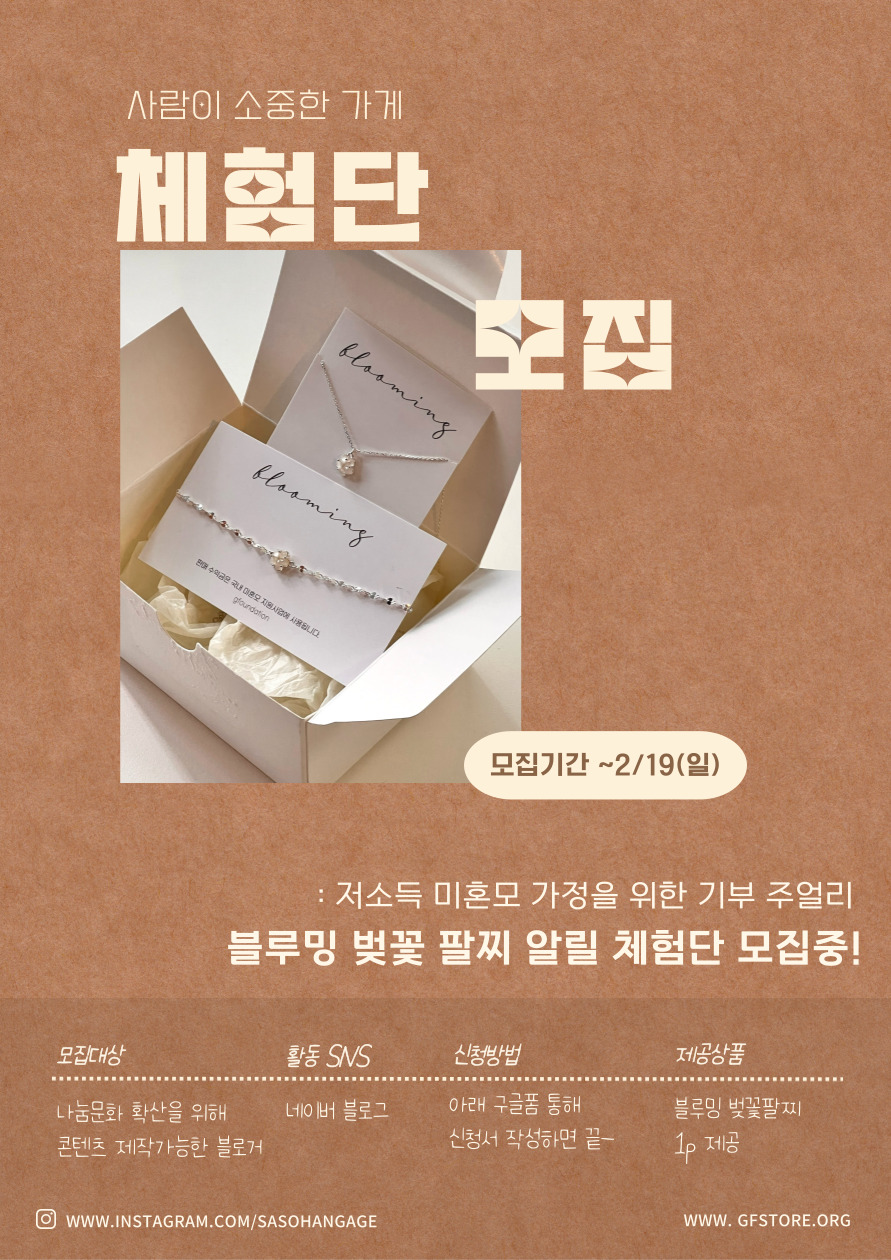 안녕하세요, NGO 지파운데이션이 운영하는 기부 악세사리 스토어 <사람이 소중한 가게>입니다. 다가오는 봄, 스테디셀러 '블루밍 벚꽃 팔찌'를 널리 알려주실 **블로그 체험단을 모집합니다! [모집 및 체험 일정] 1) 모집기간: 2월 15일(수)\~2월 19일(일) 2) 발표일: 2월 21일(화) 개별 안내 3) 상품발송일: 2월 22일(수) 발송 4) 콘텐츠 업로드 기간: 2월 23일(목)\~3월 11일(토) >>사람이 소중한 가게 블로그 체험단 신청폼: https://forms.gle/GXKR6kzJsZoRXtYc9 >>사람이 소중한 가게 온라인몰 바로가기 : https://gfstore.org/ *일정 및 신청 구글폼 내 필독사항을 꼼꼼히 확인하여 체험단 활동이 가능하신 분들만 내용 작성하여 신청 부탁드립니다🤗