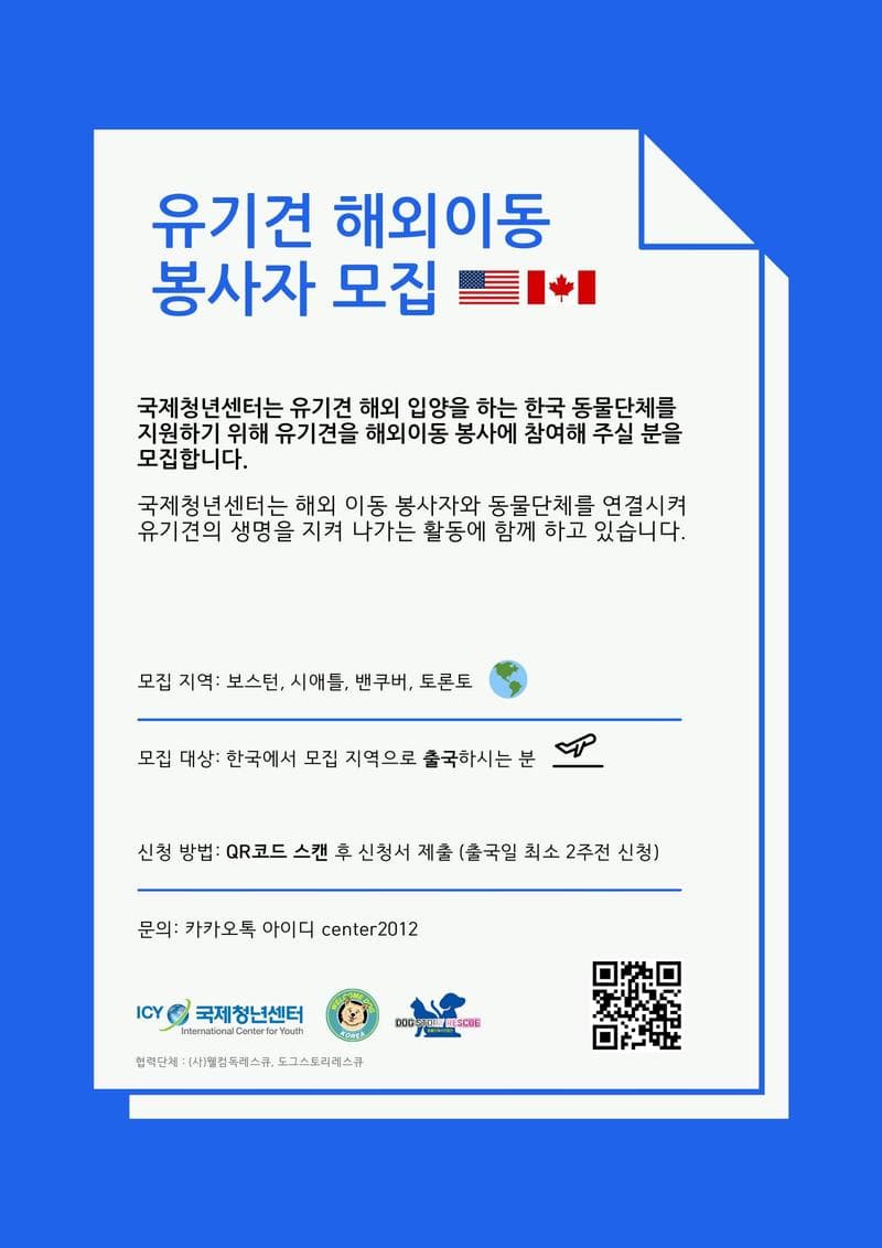 1. 해외 입양 이동 봉사자가 필요한 지역은 미국은 시애틀, 보스톤, 캐나다는 밴쿠버, 토론토 입니다. 2. 신청 기한은 미국은 출국일로 부터 최소 2주전, 캐나다는 최소 3일전에 신청하시면 됩니다. 3. 이동 봉사가 가능한 항공사는 대한항공, 아시아나, 에어캐나다 입니다. 이동봉사 목적도시가 직항이거나 1차 경유지여야 하며 경유하시는 경우 1차 경유 도시에 동물을 내려주시는데 경유시간이 4시간 이상이어야 합니다.