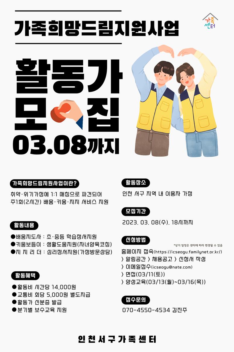 인천서구가족센터 가족희망드림지원사업 활동가(배움지도사·키움보듬이·지지리더) 모집 공고