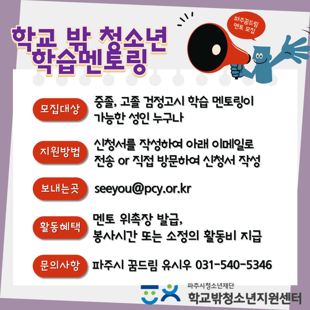 안녕하세요 :) 파주시 학교밖청소년지원센터에서 학습 멘토 선생님을 모집합니다. 아래 공고글을 참고하시어 이메일 혹은 직접 방문하여 신청서를 제출 바랍니다\~