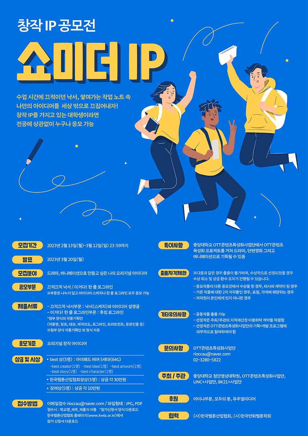 ■ 모집기간 - 2023년 2월 13일(월) \~ 3월 12일(일) 23:59 까지 ■ 응모자격 - 대학생 ■ 모집분야 - 드라마\, 애니메이션으로 만들고 싶은 나의 오리지널 아이디어 ■ 공모부문 - 끄적끄적 낙서 / 이거다! 한 줄 로그라인 ※ 부문은 나누지 않고 아이디어 스케치나 한 줄 로그라인 모두 응모 가능 ■ 제출서류 - 끄적끄적 낙서부문 : 낙서(스케치)와 아이디어 설명글 - 이거다! 한 줄 로그라인부문 : 후킹 로그라인 * 첨부 양식의 작품기획안(작품명, 장르, 대상, 제작의도, 로그라인, 트리트먼트, 등장인물 등) ※ 첨부 양식 작품기획안 외 형식 자유 ■ 접수방법 - 이메일접수 : rioccau@naver.com (접수시 파일명 : 학교명_제목_제출자 이름) - 파일 형태 : JPG\, PDF * 한국웹툰산업협회(www.kwia.or.kr)에서에서) 참가신청서 양식 다운로드 ■ 상금 및 시상 - Best상(5명) : 아이패드 에어 5세대 64G - 한국웹툰산업협회장상(5명) : 상금 각 30만원 - 장려상(5명) : 상금 각 10만원 ■ 특이사항 - 중앙대학교 OTT콘텐츠특성화사업단에서 OTT콘텐츠 육성화 프로젝트를 거쳐 드라마\, 단편영화 그리고 애니메이션으로 기획될 수 있음 ■ 출품자격제한 - 응모작품이 다른 공모전에서 수상을 한 경우\, 타사와 계약이 된 경우 - 기존 작품에 대한 2차 저작물인 경우\, 표절\, 각색에 해당하는 경우 - 저작권이 본인에게 있지 아니한 경우 ※ 다음과 같은 경우 출품이 불가하며, 수상작으로 선정되었을 경우 수상 취소 및 상금 환수 조치가 진행될 수 있습니다. ■ 기타유의사항 - 공동작품 출품 가능 - 선정작은 주최/주관의 지적재산권 이용허락 계약을 체결함 - 선정작은 OTT콘텐츠특성화사업단의 기획•개발 프로그램에 의무적으로 참여하여야 함 ■ 문의사항 - OTT콘텐츠특성화사업단 (rioccau@naver.com / ☎ 02-3280-5822) 지원서 다운로드