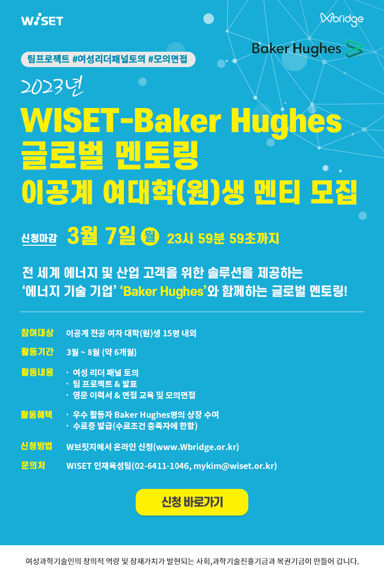 2023년 WISET-Baker Hughes 글로벌 멘토링 멘티 모집 (\~3/7, 화)