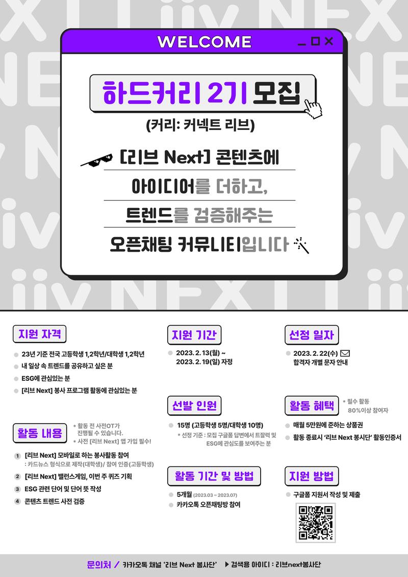 안녕하세요:) [리브 Next 봉사단]이 Z세대에게 더 즐거운 콘텐츠를 제공하기 위해 '하드커리' 2기를 모집합니다! 🙌 [리브 Next] 콘텐츠에 아이디어를 더하고, [리브 Next] 앱을 통해 봉사활동 프로그램에 참여하는 오픈채팅 커뮤니티 '하드커리'로 여러분을 초대하고자 합니다😎 + '하드커리'로 선정이 안되더라도, [리브 Next] 앱을 통해 신청할 수 있는 봉사 프로그램 오픈 시 문자로 온라인 신청 링크 안내받을 수 있습니다❗ 콘텐츠 아이디어를 공유하고 싶고, 만남 없이 오픈채팅만으로도 트렌디해질 수 있는 기회를 찾고 싶은 분들의 많은 참여 바랍니다🙏