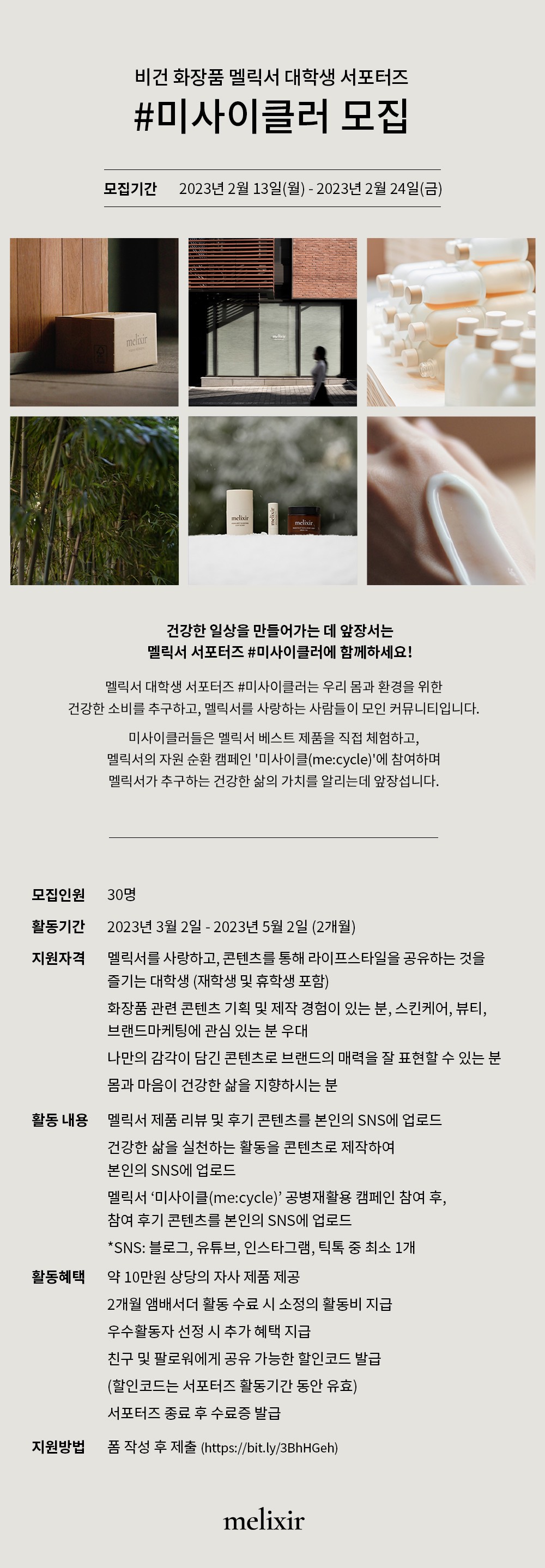 🌿신청조건 : 직접 운영하는 소셜미디어 플랫폼이 있는 분 (인스타그램, 유튜브, 네이버 블로그, 브런치 등) 🌿신청절차 : 서류심사 ► 최종합격 🌿활동기간 : 2023년 3월 02일 - 2023년 5월 02일 (2개월) 🌿최종 합격자 발표 : 2023년 2월 27일(월) (개별 연락) 🌿활동내용 - 멜릭서 제품 리뷰 및 후기 콘텐츠를 본인의 SNS에 업로드 - 멜릭서의 공병재활용 캠페인 참여 후\, 참여 후기 콘텐츠를 본인의 SNS에 업로드 *SNS: 블로그, 유튜브, 인스타그램, 틱톡 중 최소 1개