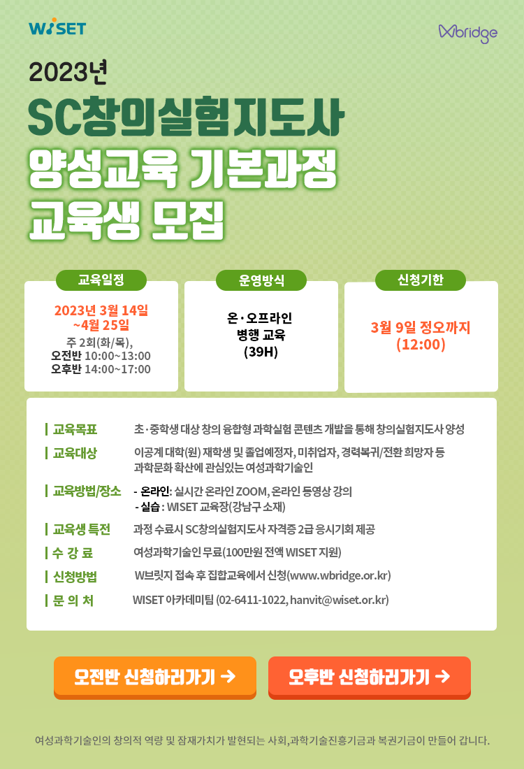 [2023년 SC 창의실험지도사 양성교육 기본과정 교육생 모집] (1) 목적: 초·중학생 대상 창의융합형 과학실험콘텐츠 개발을 통해 창의실험지도사로 양성될수 있도록 지원함 (2) 대상: 이공계 전공 대학(원) 재학생 및 졸업예정자, 미취업자, 경력복귀/전환 희망자 등 과학문화 확산에 관심 있는 여성과학기술인 50명 (3) 일시: 2023.03.14.\~ 2023.04.25. 매주 화/목, 오전반 10:00\~13:00/오후반 14:00\~17:00 ※ 동일내용으로 오전/오후 2개 반으로 운영됨 (4) 내용: W브릿지 공지사항 참조 (https://bit.ly/3E4VrOG) (5) 교육비: 무료 (6) 신청 마감: \~3/9(목) 12:00까지 (7) 신청 바로가기: 오전반 https://bit.ly/3Ih3QBi / 오후반 https://bit.ly/40O9OAT