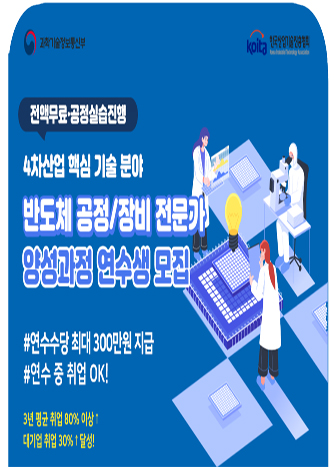 [반도체 공정/장비 전문가 양성과정] ● 접수 기간 : \~ 03. 17(금) 13시까지 ● 연수 기간 : 2023.03.27\~2023.09.26 (4개월 취업 및 직무연수 + 2개월 기업연수 진행)