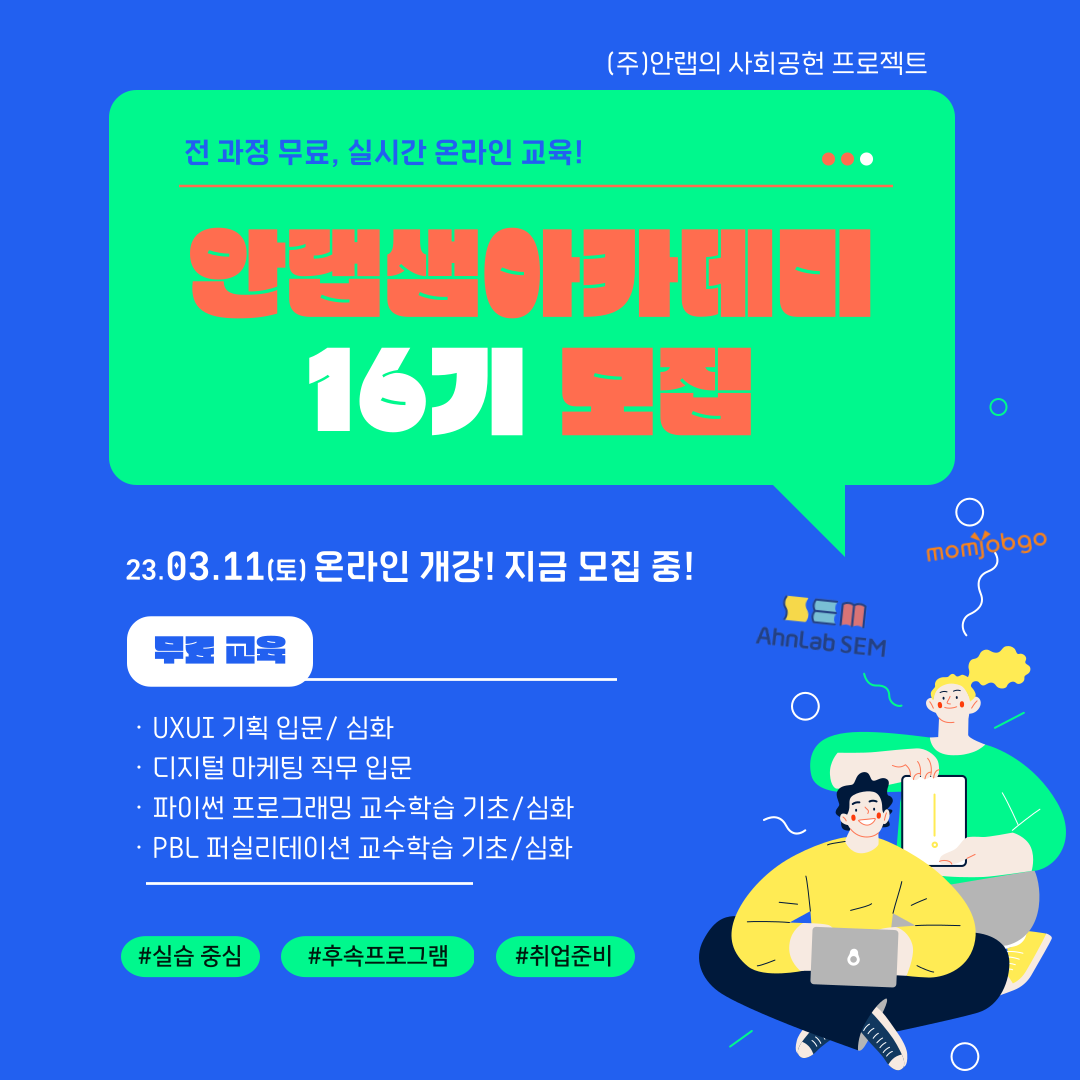 인터넷 통합보안 대표 기업 (주)안랩의 사회공헌 프로젝트 『안랩샘아카데미』 16기, 곧 시작됩니다.