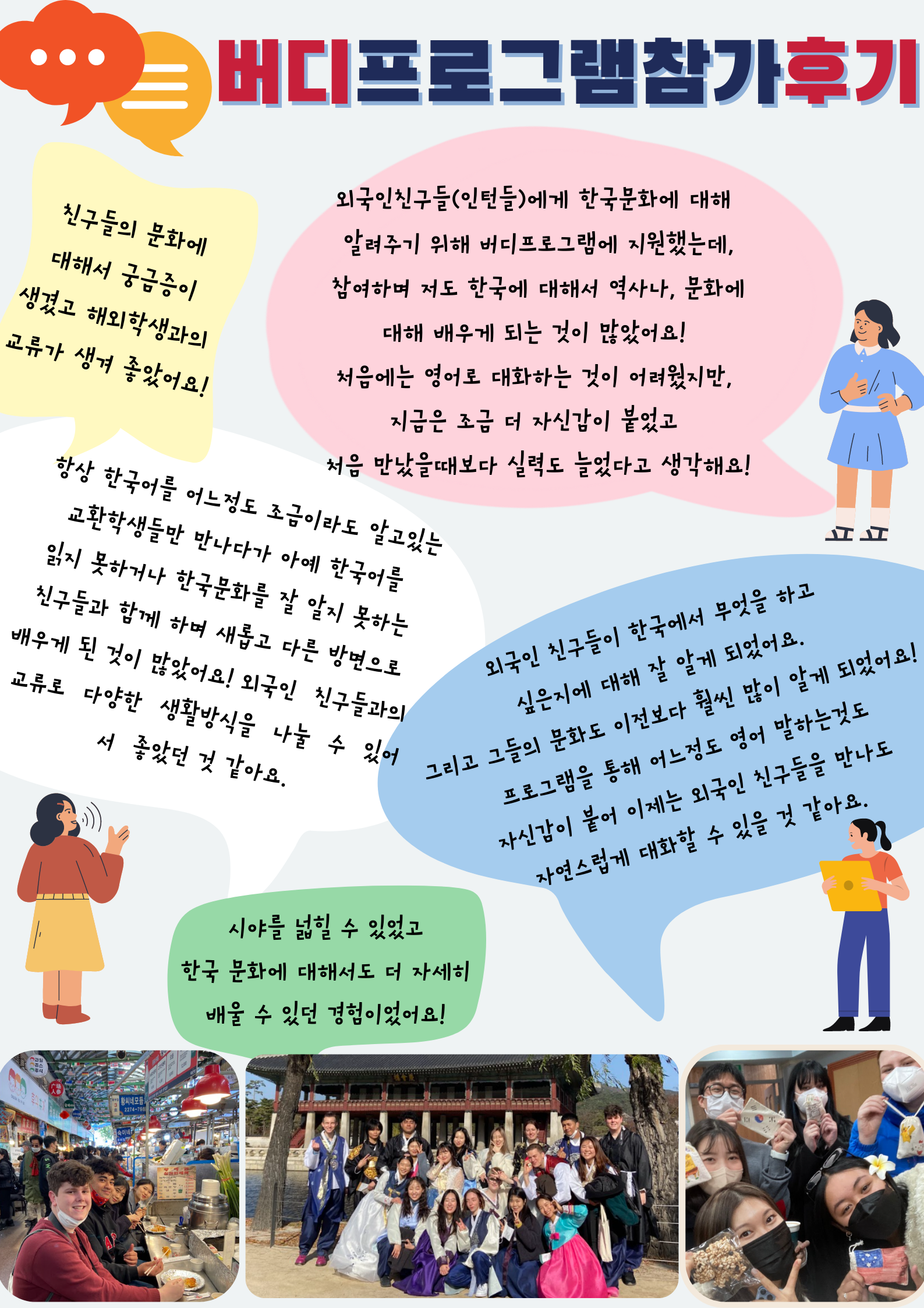한국 언어/문화에 대한 이해를 높이기 위해 한국 로컬 학생과의 버디 프로그램을 희망하고 있습니다!