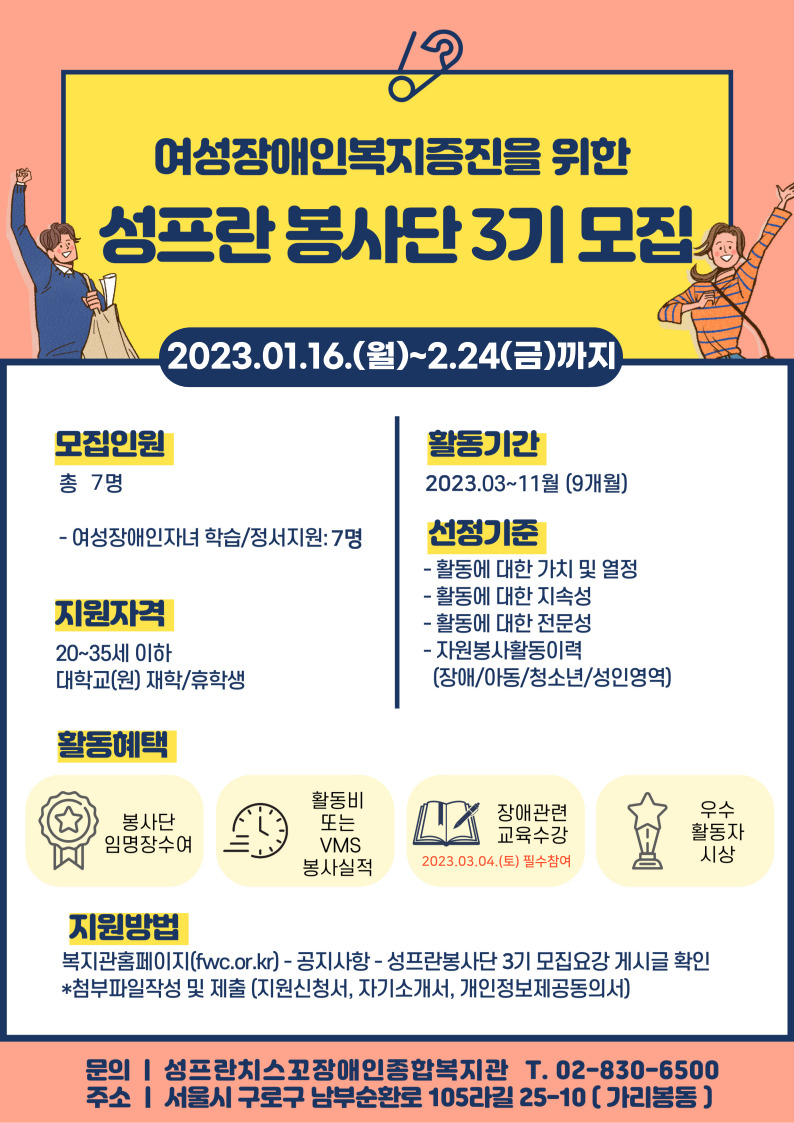 여성장애인복지증진을 위한 성프란봉사단 3기를 모집합니다! 접수기간: 2023.02.17(금) \~ 02.24.(금)