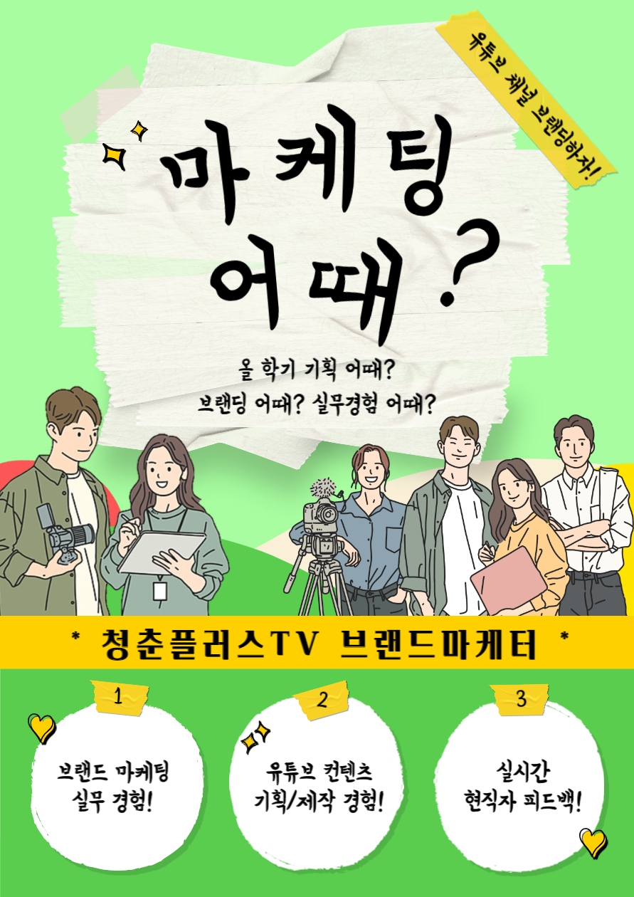 ▶ 활동 혜택 ☝어디서도 들을 수 없는 마케팅/광고 기획사 현직자의 유튜브 영상 제작 이론 강의 ✌나의 채널을 운영, 홍보하기 위한 네이버&구글 알고리즘 습득 🤟진로와 취업을 같이 고민해 줄 대기업 실무진 선배님들과의 1:1 멘토링 🤚콘텐츠, 영상 마케팅 직무를 꿈꾸는 청춘들을 위한 직무교육