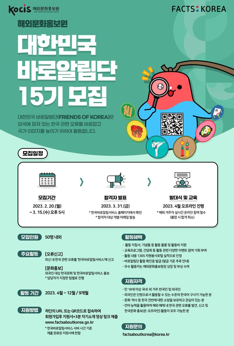 - 문화체육관광부 해외문화홍보원은 대한민국에 대한 올바른 정보와 아름다운 문화를 전 세계에 알리기 위하여 ‘대한민국 바로알림단’과 ‘한국바로알림서비스’를 운영하고 있습니다.