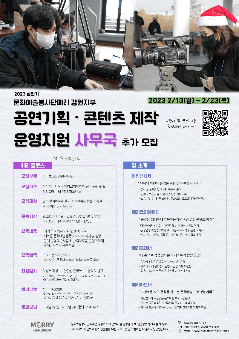 [제목] 문화예술봉사단메리 강원지부 기획단원(사무국) 추가 모집 (2/13 \~ 2/23) [본문] 비영리 사단법인 문화예술봉사단메리는 2015년부터 청소년과 대학생이 하나 되어 시민을 위한 오케스트라 및 합창 공연을 하는 문화예술봉사단체입니다. 문화예술이 살아 숨쉬는 춘천에서 문화예술봉사단메리 강원지부와 함께 즐겁고 행복한 문화예술을 선물할 사무국을 모집합니다. ◈ 지원서 및 상세내용 확인하러 가기! https://url.kr/3hrwl8 ◈ • 모집부문 : 메리클로스 강원지부 8기 *메리클로스란? 문화예술봉사단메리에서 기획단원(사무국)을 지칭하는 용어 • 모집기간 : 2023년 02월 13일 (월) \~ 2023년 02월 23일 (목) • 모집대상 : 평소 문화예술을 즐기며 춘천에서 활동 가능한 20세 이상 청년 누구나 • 활동내용 : 1) 메리 주요 행사 기획 및 운영 지원 2) 새로운 문화예술 활동 아이디어 제시 및 실행 3) 단체 운영과 홍보를 위한 다채로운 콘텐츠 제작 • 활동기간 : 2023년 03월 04일 \~ 2023년 08월 21일 (6개월) *정기회의 - 매주 토요일, 14:00 \~ 17:00, 춘천공연예술연습공간 • 주요활동일정 : 1) 발대식 - 2023년 03월 04일 2) 문화봉사 - 2023년 05월 20일 3) 자선연주회(메리투게더 in 롯데콘서트홀) - 2023년 08월 21일 *해단식 일정은 추후 공지 • 활동비 납부 : 7만원, 연습 공간 및 공연장 대관 등 음악봉사 운영에 필요한 비용으로 사용됩니다 • 활동혜택 : 봉사시간(1365) 지급, 법인 명의 수료증 • 우대조건 : 1) 공연기획 또는 문화예술행사 경험이 있는 자 2) 소셜미디어마케팅에 관심이 많거나 콘텐츠제작 경험이 있는 자 3) 이미지 및 영상 툴 (adobe) 활용에 관심이 많거나 활용 가능한 자 4) 열정과 배우고싶은 의지가 가득한 자 * 위 내용은 우대사항일 뿐 합격 여부와는 상관없습니다. • 메리가 궁금하다면 ? - 공식 홈페이지 : https://www.wearemerry.org - 공식 유튜브 : https://url.kr/j29a68 • 문의 : - 문화예술봉사단메리 강원지부 이메일 (wearemerry_gw@naver.com) - 문화예술봉사단메리 강원지부 인스타그램 DM (https://www.instagram.com/we_are_merry_gw/) - 문화예술봉사단메리 강원지부 페이스북 메시지(www.facebook.com/wearemerry.gw)