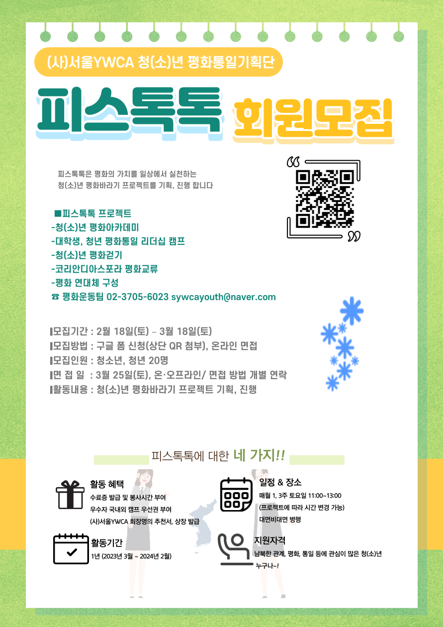 사단법인 서울YWCA에서 청(소)년 평화통일 기획단 피스톡톡 신입회원을 모집합니다. 국제 관계, 남북한, 해외 연수, 평화, 통일 등에 관심이 많은 청(소)년 누구나 참여 가능합니다. 많은 관심과 지원 부탁드립니다. 감사합니다:D ▶ 이전 주요 활동 내역 2015: DMZ 철원 국경선 학교 평화통일캠프 2016: 중국 연변·백두산 평화통일캠프, 청년 평화통일 라운드테이블 2017: 러시아 연해주 평화통일캠프, 평화통일리더양성 교육·워크숍 2018-2019: 일본 규슈 평화통일캠프, DMZ 평화걷기 2020: 북중러 접경지역 평화통일캠프, 평화통일세미나 2021-2022: 서울에서 분단을 마주하는 평화 캠프, 코리안디아스포라 평화교류 ▶ 피스톡톡(Peace Talk Talk) 프로젝트 - 청(소)년 평화아카데미 - 대학생\, 청년 평화통일 리더십 캠프(국내·국외) - 청(소)년 평화걷기 - 코리안디아스포라 평화교류 - 평화 연대체 구성 모집기간: 2월 18일(토) - 3월 18일(토) 모집방법: 구글폼 신청 + 온라인 면접 모집인원: 청소년, 청년 20명 면접일시: 3월 25일(토) 온오프라인 / 면접 방법 개별 연락 활동방법: 비대면·대면 병행 접수방법: 큐알코드 혹은 구글폼 주소 클릭하여 신청서 제출 회비 : 1년 11,000원 혜택 - 수료증 발급, 봉사시간 부여 - 우수자 국내외 캠프 우선권 부여 - 우수자 서울YWCA회장명의 추천서 발급 구글 접수 : https://forms.gle/yKZsUzt7XWNp3QSH8 홈페이지 접수 : https://www.seoulywca.or.kr/bbs/board.php?bo_table=board0306&wr_id=112 문의: 평화운동팀 (02-3705-6023 / sywcayouth@naver.com)