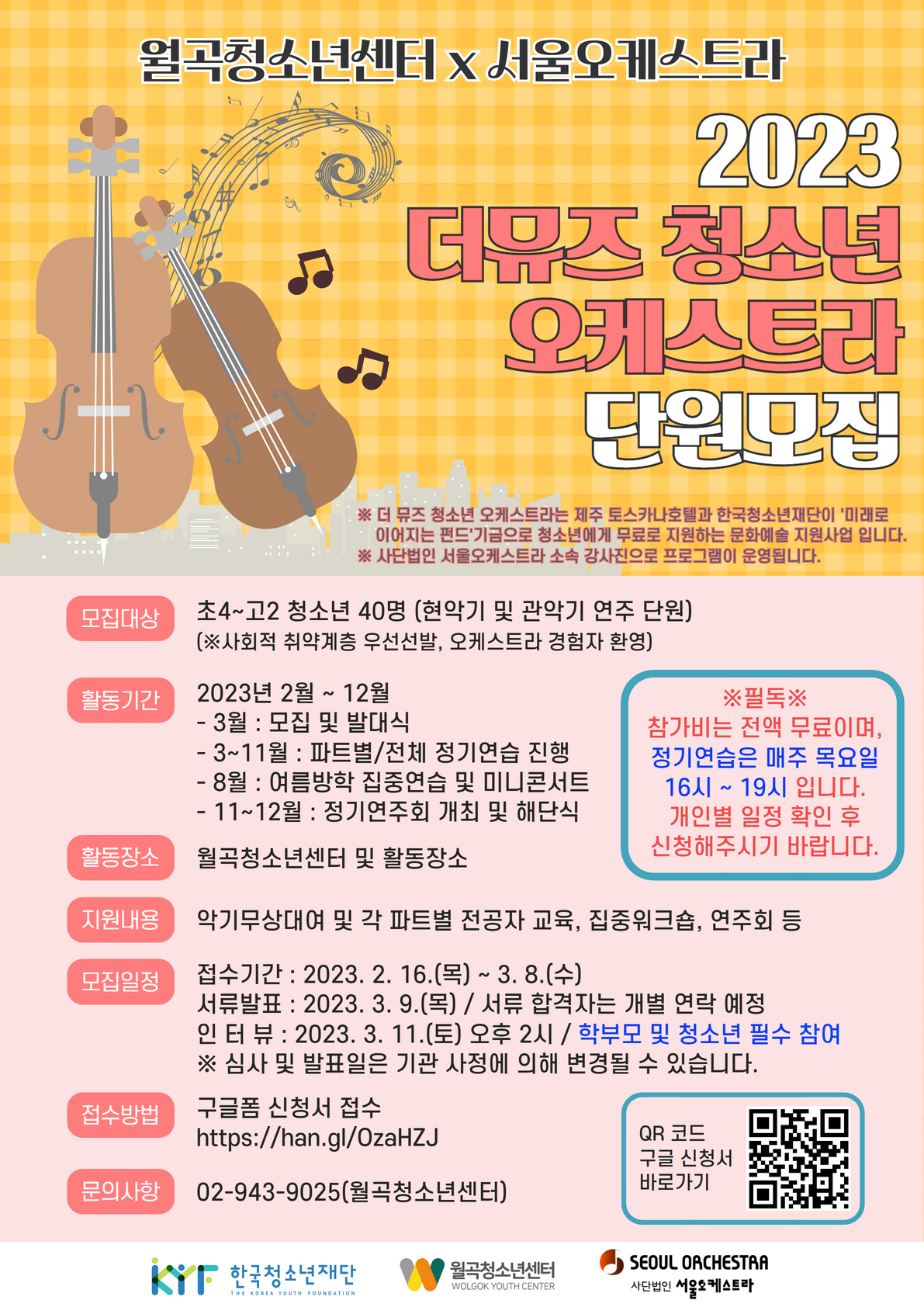 ※ 더 뮤즈 청소년 오케스트라는 제주 토스카나호텔과 한국청소년재단이 '미래로 이어지는 펀드'기금으로 청소년에게 무료로 지원하는 문화예술 지원사업 입니다. ※ 사단법인 서울오케스트라 소속 강사진으로 프로그램이 운영됩니다. 🌈아래 모집 개요를 필히 읽어주세요!!🌈 ※필독※ 참가비는 전액 무료이며, 정기연습은 매주 목요일 16시 \~ 19시 입니다. 개인별 일정 확인 후 신청해주시기 바랍니다. *모집대상 : 초4\~고2 청소년 40명 (현악기 및 관악기 연주 단원) (※사회적 취약계층 우선선발, 오케스트라 경험자 환영) *활동기간 : 2023년 3월 \~ 12월 - 3월 : 모집 및 발대식 - 3\~11월 : 파트별/전체 정기연습 진행 - 8월 : 여름방학 집중연습 및 미니콘서트 - 11\~12월 : 정기연주회 개최 및 해단식 *활동장소 : 월곡청소년센터 및 활동장소 *지원내용 : 악기무상대여 및 각 파트별 전공자 교육, 집중워크숍, 연주회 등 *참가비 : 무료 *모집일정 1)접수기간 : 2023. 2. 16.(목) \~ 3. 8.(수) 2)서류발표 : 2023. 3. 9.(목) / 서류 합격자는 개별 연락 예정 3)인 터 뷰 : 2022. 3. 11.(토) 오후 2시 / 학부모 및 청소년 필수 참여 ※ 심사 및 발표일은 기관 사정에 의해 변경될 수 있습니다. *접수방법 : https://han.gl/OzaHZJ 구글 신청서 접수 *문의처 : 02-943-9025 (청소년사업팀) 많은 관심과 신청바랍니다^^