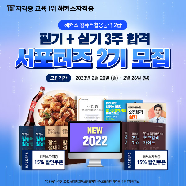 ✅ 해커스 컴퓨터활용능력 2급 단기합격반 패스강의 ✅ 서포터즈 전원 전자 명함 수여 ✅ 굽네치킨 오리지널 + 콜라 1.25L 쿠폰 ✅ 스펙 증명을 위한 수료증 수여 ✅ (우수참여자 한정) 한능검 / 한국어 유료 강의 무료 수강권 ✅ (우수참여자 한정) 해커스 자격증 15% 할인 쿠폰