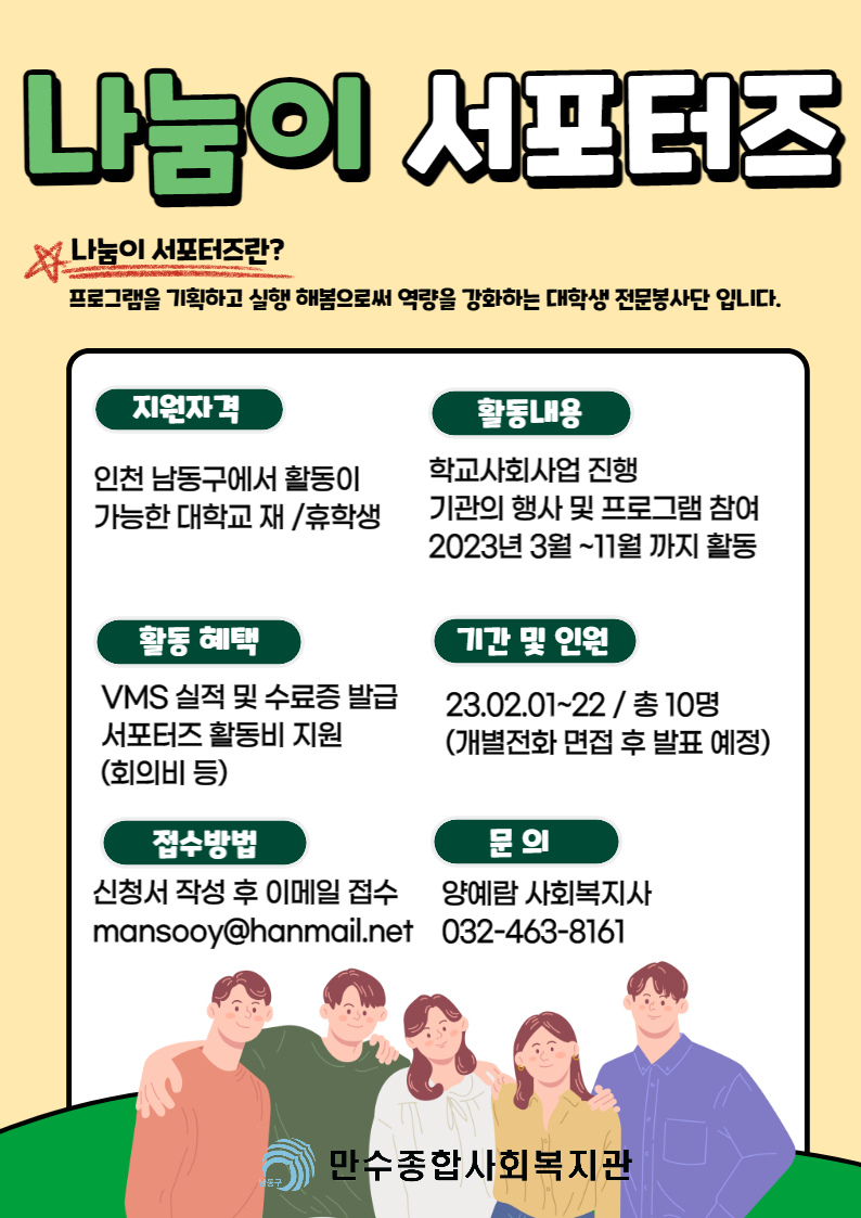 ○ 지원 자격 - 인천 남동구에서 활동이 가능한 대학교 재/휴학생 - 단순 봉사활동이 아닌\, 직접 기획하고 진행해보는 경험을 쌓고 싶은 분