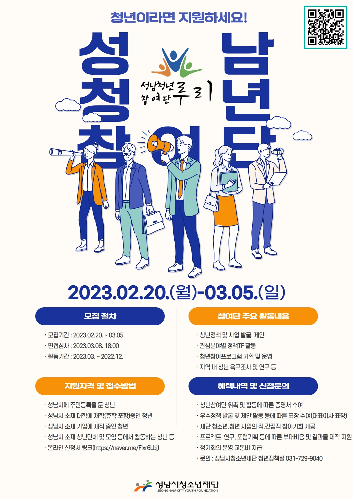 (재)성남시청소년재단에서는 청년이 지역사회 구성원으로서 다양한 분야의 현안 사항에 대해 청년의 시각으로 함께 논의하고 제안하는 정책 참여조직인 제3기 청년 참여단을 구성ㆍ운영하고자 모집합니다. 이에 역량 있는 성남시 청년 여러분의 많은 관심과 참여 바랍니다. 2023년 2월 20일 성남시청소년재단대표이사 1. 모집 기간 : 2023. 2. 20.(월) \~ 3. 5.(일) 2. 모집 인원 : 20명 내외 3. 모집 대상 : 만19세 이상 \~ 34세 이하의 청년 중 다음에 해당하는 자 - 성남시에 주민등록을 둔 청년 - 성남시 소재 대학에 재학(휴학 포함)중인 청년 - 성남시 소재 기업에 재직 중인 청년 - 성남시 소재 청년단체 및 모임 등에서 활동하는 청년 등 4. 지원방법 - 온라인 신청서 링크(https://naver.me/Flxr6Lbj)를 통해 제출 5. 활동기간 : 2023.03. \~ 12.31. (연임가능 / 지속활동 가능) 6. 주요역할 - 청년정책 및 사업 발굴, 제안 - 관심분야별 분과모임 활동 - 청년정책포럼 기획 및 운영 - 지역 내 청년 욕구조사 및 연구 등 7. 활동 혜택 - 청년참여단 위촉 및 활동에 따른 증명서 수여 - 우수정책 발굴 및 제안 활동 등에 따른 표창 수여(대표이사 표창) - 재단 청소년․청년 사업의 직․간접적 참여기회 제공 - 참여단 활동에 따른 봉사활동 시간 지급 - 프로젝트, 연구, 포럼기획 등에 따른 부대비용 및 결과물 제작 지원 - 정기회의 운영 교통비 지급 8. 모집 절차