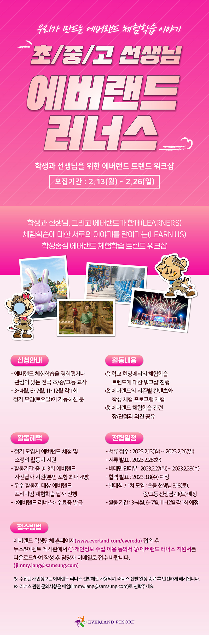 ■ 접수 방법 에버랜드 학생단체 홈페이지(www.everland.com/everedu) 접속 후 뉴스&이벤트 게시판에서 ① 개인정보 수집· 이용 동의서, ② 에버랜드 러너스 지원서 를 다운로드하여 작성 후 담당자 이메일로 접수 바랍니다(jimmy.jang@samsung.com)