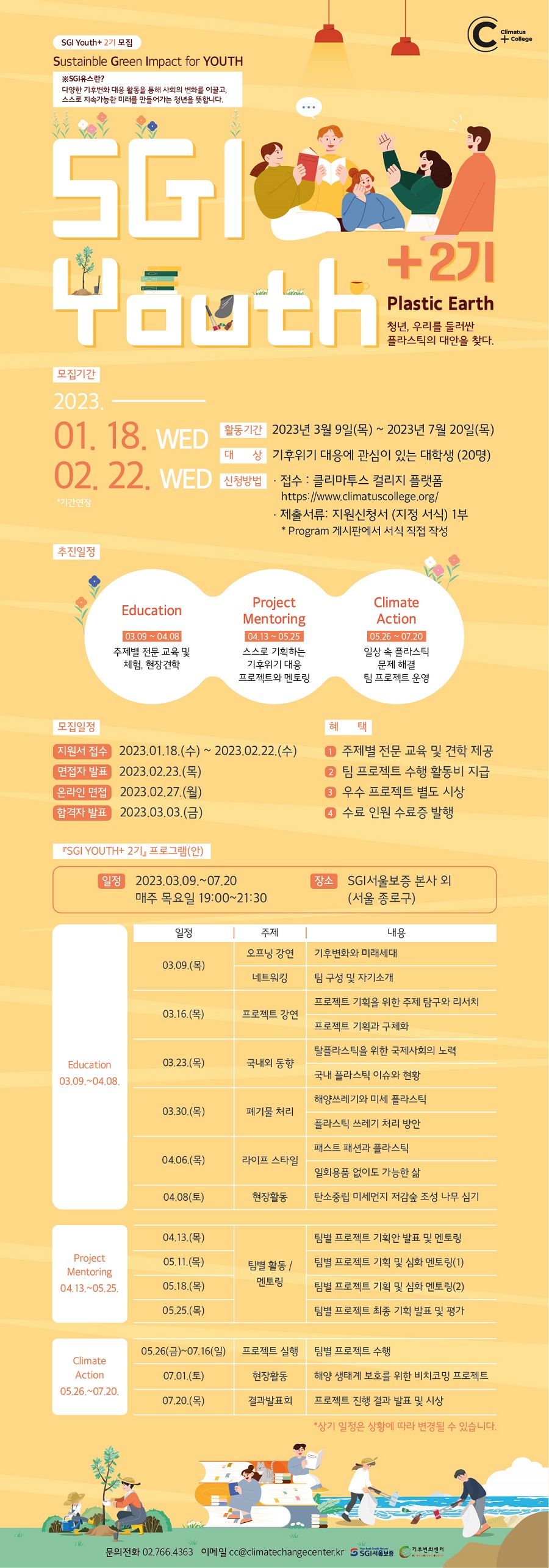 올해는 나날이 심각해지는 플라스틱 문제에 집중하여 "Plastic Earth - 청년, 우리를 둘러싼 플라스틱의 대안을 찾다"라는 주제로 SGI YOUTH+2기를 진행합니다.