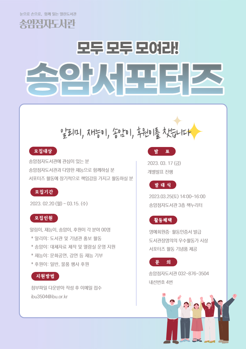 송암점자도서관에서는 아래와 같이 도서관과 함께할 송암서포터즈를 모집하고자 하오니 많은 관심과 참여 바랍니다. 2023.02.20. 송암점자도서관장
