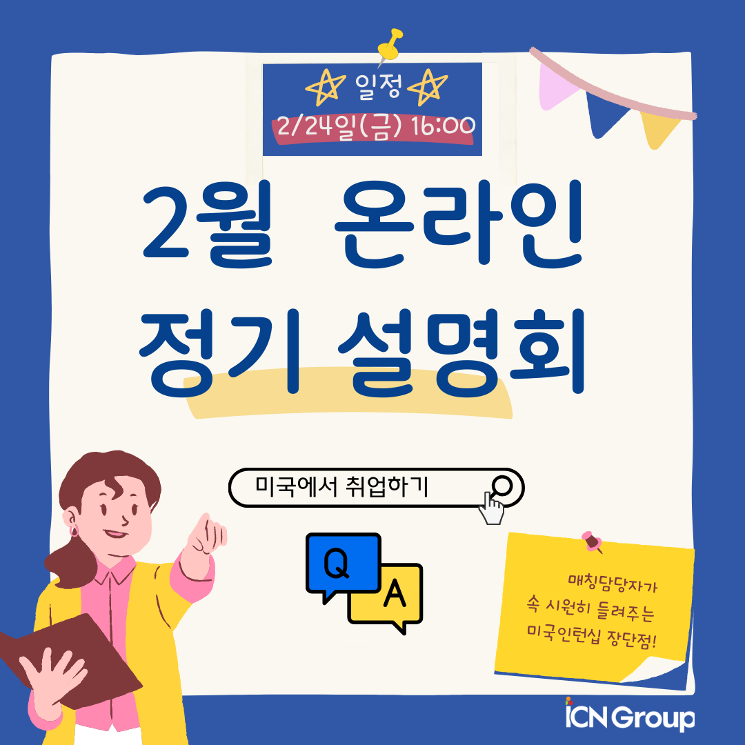 ○ 모집개요 - 미국인턴 전문기관 ICN Group 매칭담당자가 속시원히 들려주는 미국인턴십 장단점! A-Z 미국 인턴십/취업에 관심있는 사람 누구나 환영 해외근무 경험을 쌓고 싶은데, 어디서 어떻게 시작해야 할지 막막하시죠? 궁금한 거 다\~해결해드립니다 :)