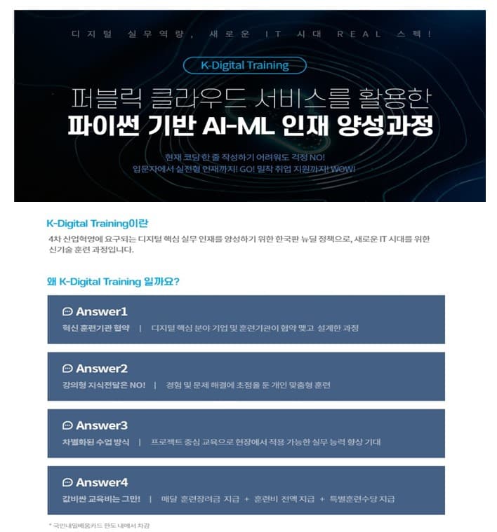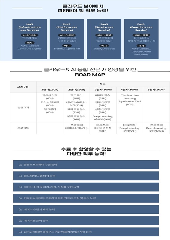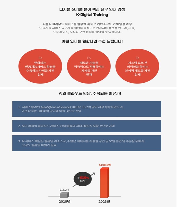 ■ 참여희망분야 : 인공지능 서비스 구현 ■ 훈련기관명 : 케이지에듀원 아이티뱅크종로학원 ■ 훈련과정명 : 퍼블릭 클라우드 서비스를 활용한 파이썬 AI-ML 인재 양성 과정 ■ 훈련기관 : 2023년 04월 06일 \~ 2023년 09월 04일 (100일 / 800시간) ■ 훈련비 : 7,581,600원(전액무료) ■ 수료후관련직업 : 인공지능분야, 클라우드분야, 빅데이터분야 - 요구되는특성 : 인공지능 서비스의 요구사항을 실현하기 위한 인공지능 플랫폼의 인프라\, 기능\, 인터페이스\, 지식화를 구현할 수 있어야 함 - 주요업무 : 인공지능 서비스의 요구사항을 실현하기 위한 인공지능 플랫폼의 인프라\, 기능\, 인터페이스\, 지식화를 구현 ■ 관련자격증 : 정보처리기사 또는 IT관련 민간 자격 1급이상 정보처리산업기사 또는 IT관련 민간 자격 2급이상, 빅데이터분석기사 - 자격증개요 : 자바기반의 모든틀 영역에 필요한 기초능력을 인정받을 수 있는 국제자격증 - 시험과목\,시험일등 취득방법 : 정보처리산업기사&정보처리기사 : 매년 3\~4회 필기/실시 시험 시해중 빅데이터분석기사 : 매년 4회 시험 시행 중 ■ 과정문의 : 안내링크 : http://www.kg-itbankaplus.com 교육과정 : http://www.kg-itbankaplus.com/bbs/board.php?bo_table=notice&wr_id=141&page=2 전화문의 : 1544-4527