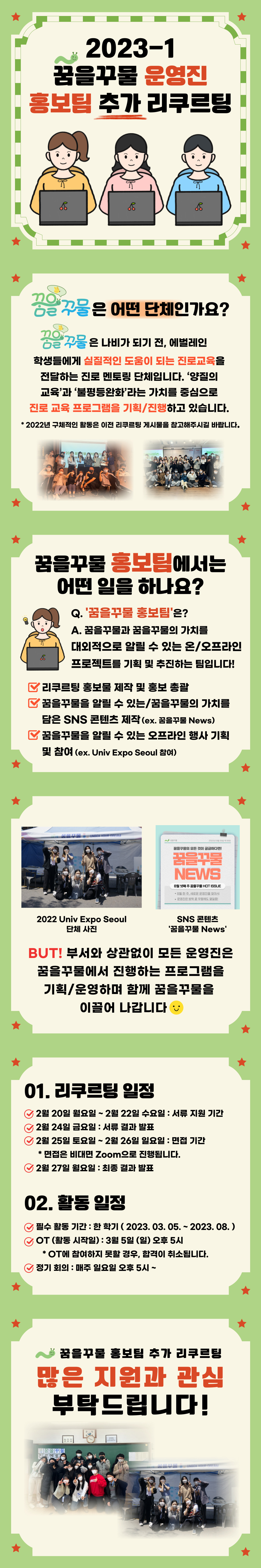 💚 진로교육봉사단체 꿈을꾸물 2023-1 운영진 ‘홍보팀’ 추가 리크루팅 💚