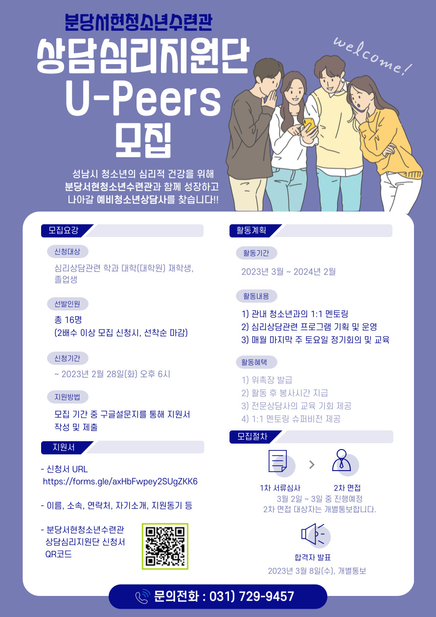 분당서현청소년수련관에서 함께 성장하고 나아갈 예비청소년상담사 2023 상담심리지원단 U-Peers를 모집하고자 합니다!!