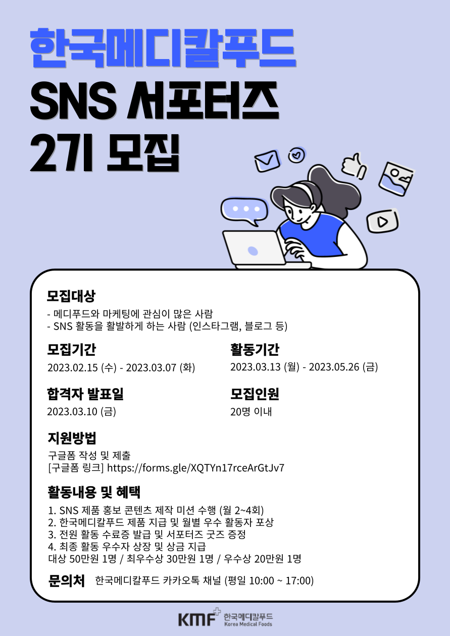 '좋은 영양공급'과 '고객 삶의 질 향상'을 최우선으로 하는 임상영양 전문기업, 한국메디칼푸드에서 ‘SNS 서포터즈 2기’를 모집합니다!