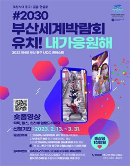 ‘2030 부산세계박람회 유치기원’을 담은 숏폼 형식의 전 국민 UCC 콘테스트를 개최하오니 많은 참여 바랍니다.