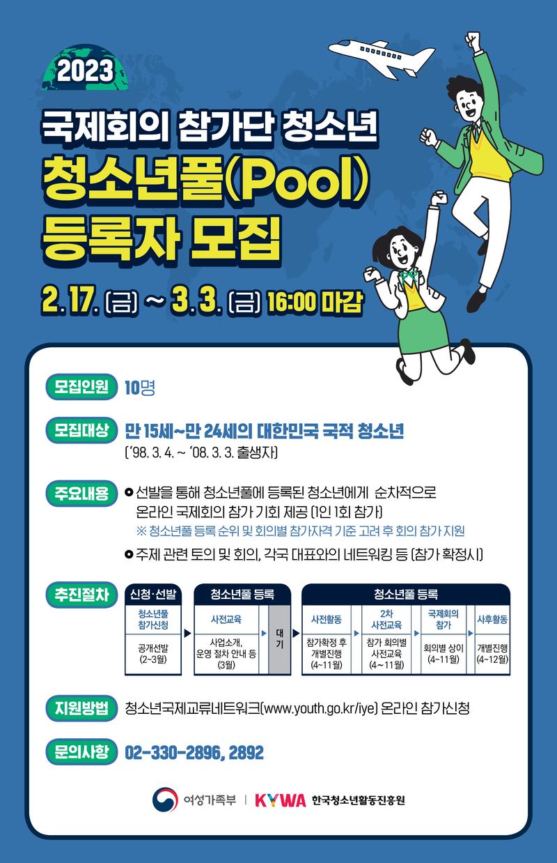 4. 기타사항 - 선발된 청소년은 다음년도(2024년) 국제회의 참가단 선발 이전까지 개최된 행사(회의) 1회에 한해 참가 가능(복수의 회의 중복 참여 불가) - 청소년풀 등록 순위 및 회의별 참가자격 기준에 따라 순차적으로 참여 기회 제공