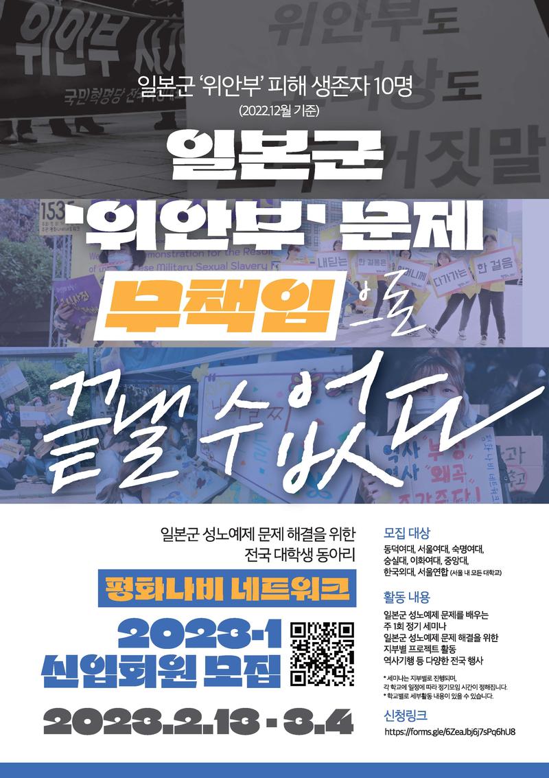 일본군 성노예제 문제의 정의로운 해결을 위해 활동하는 전국 대학생 연합동아리 평화나비 네트워크 서울지역 신입회원을 모집합니다!🕊