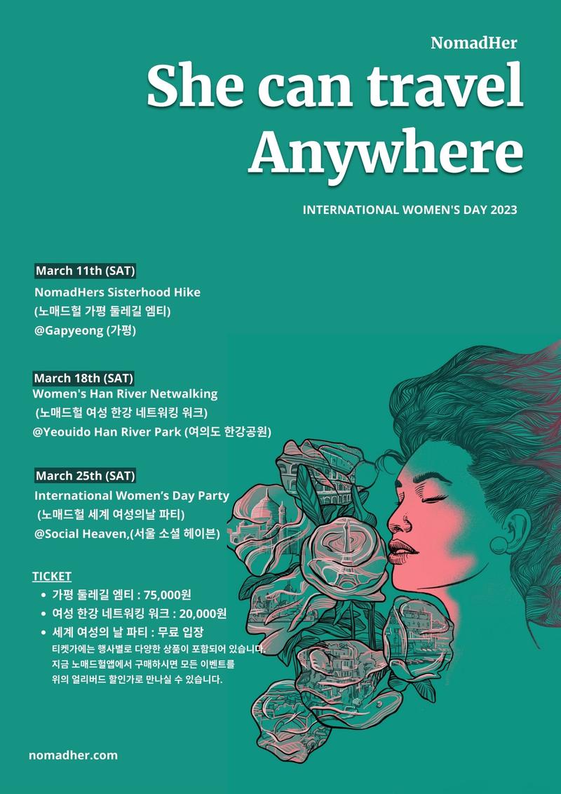 ▶ 활동내용 프랑스 파리에서 시작해 전세계 여성 여행자들의 안전한 혼자 여행을 응원하는 스타트업 노매드헐에서 3월 여성의 날 캠페인을 시작합니다. "She Can Travel Anywhere"라는 주제로 여성들의 여행에 영감을 불어넣어줄 이벤트를 개최합니다.