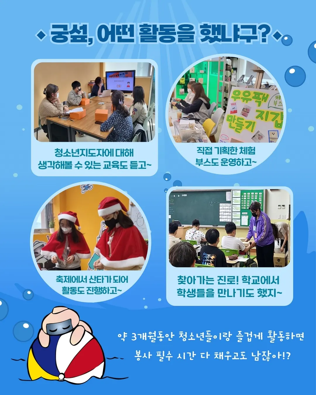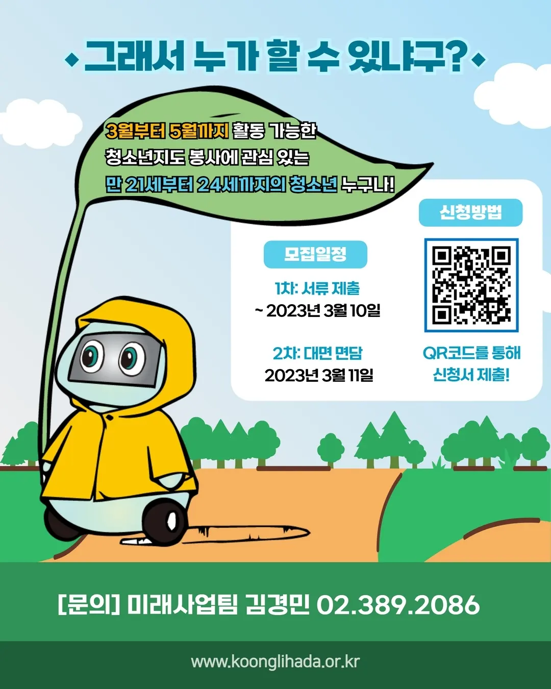궁리 서포터즈는 #청소년지도자 교육, #기획 #부스 운영, #학교 로 찾아가는 #진로 활동 등의 다양한 #청소년활동 을 통해 #청소년 과 함께 성장하는 청소년 #지도 #봉사 #동아리 입니다 [모집대상] 3월부터 5월까지 활동 가능한 청소년 지도 봉사에 관심 있는 만 21세부터 24세까지의 청소년 [모집일정] 1차: 서류제출 \~3월 10일까지 2차: 대면면담 3월 11일 즐겁게 봉사하고 싶다면? QR코드를 통해 신청서를 제출하세요 대면 면담 일정은 서류 확인 후 별도 안내드립니다 [문의] 미래사업팀 김경민 02-389-2086 _