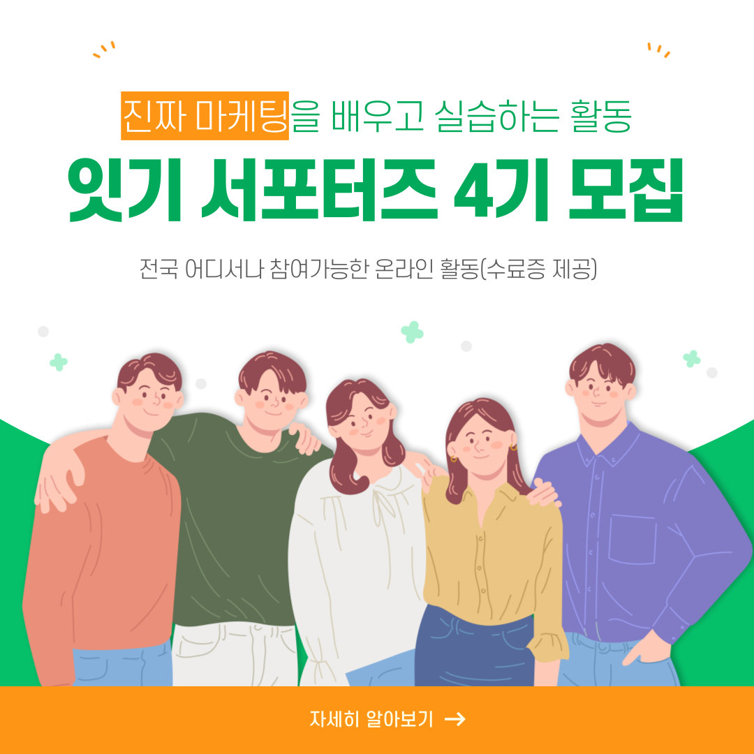 * 주의사항 * 잇기 서포터즈는 상품 또는 활동비를 지급하지 않습니다. 마케팅의 지식과 경험 그리고 성과에 따른 보상을 드립니다.