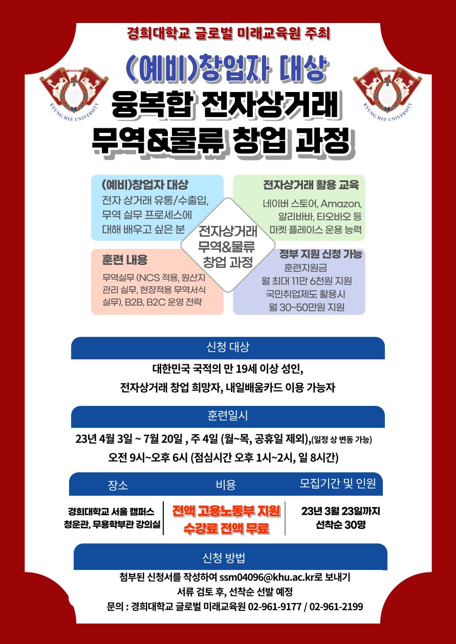 경희대 특화전문 국비교육 2023년도 1차 융복합 전자상거래 무역물류 창업과정 안내 일자리 창출을 위한 창업 연계 훈련과정 (국비 전액 무료교육 (내일배움카드) / 매월 훈련수당 지급 / 국민취업지원제도 참여 가능) 국내외 오픈마켓 등에 입점하고 싶은데 망설이는 분, 자신있는 아이템을 해외에 수출해보고 싶은 분, 판매풀을 확장해 매출을 올리고 싶으신 (예비)창업자 주목! 온라인 진출을 위한 전자상거래 실무교육 매출향상을 위한 맞춤 마케팅 활용능력 배양**