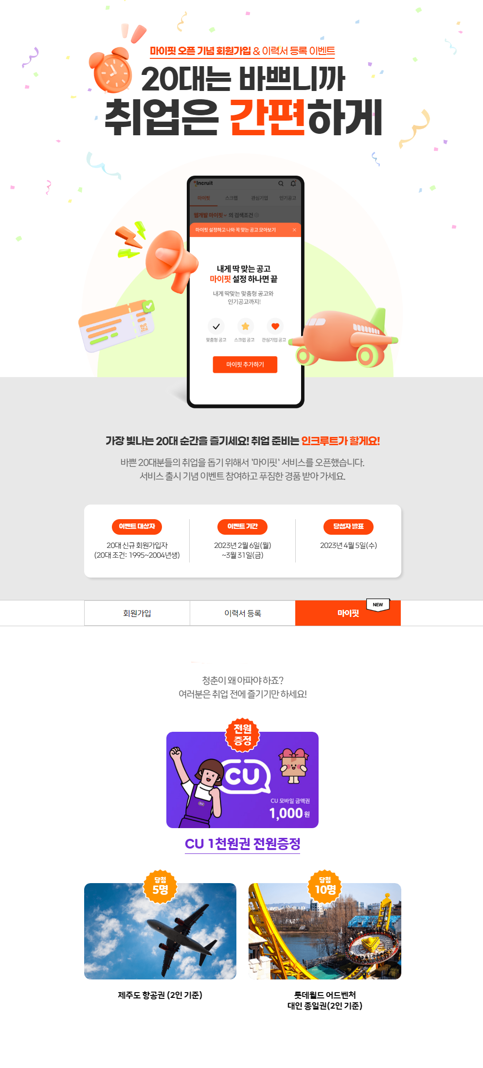 20대 여러분들을 위해 인크루트가 CU 상품권, 네이버페이 전원 증정 및 추첨을 통해 제주도 항공권 롯데월드 이용권을 선물해 드려요!
