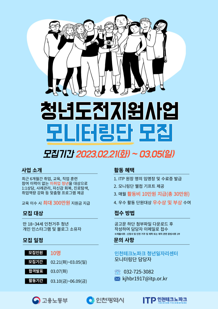 안녕하세요, 인천테크노파크 청년일자리센터입니다. 고용노동부와 인천광역시, 인천테크노파크가 미취업 청년의 사회활동 참여 의욕 고취를 위한「청년도전 지원사업」을 시행합니다.