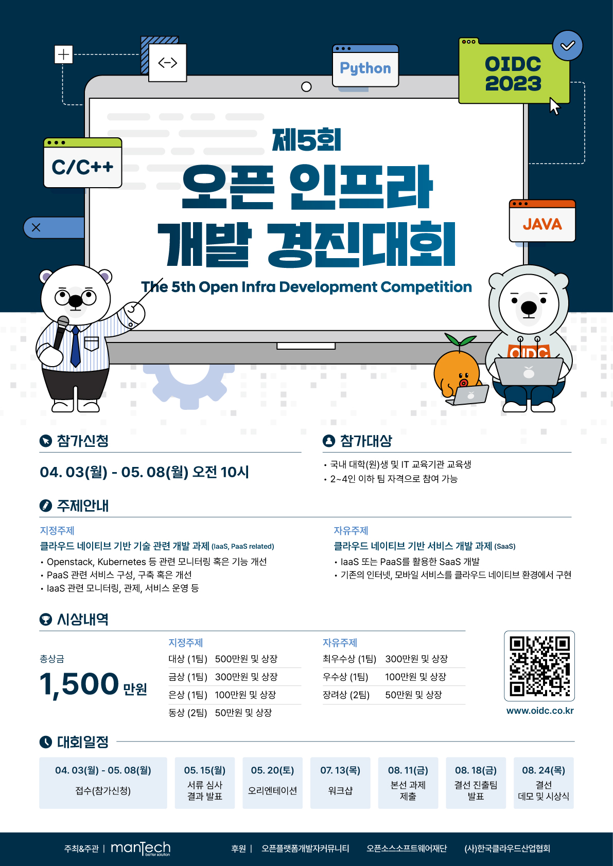 ㈜맨텍은 대학(원)생들이 SW 기업 현장의 개발환경을 이해하고, 클라우드 기반 최신 개발 및 운영 환경을 습득하며, 오픈소스를 활용해 창의적인 아이디어를 SW로 개발하는 능력을 향상시키고, 역량 있는 국내 중소기업에서 함께 성장할 수 있는 인재를 양성하기 위해 ‘제5회 오픈 인프라 개발 경진 대회 (OIDC 2023)’를 개최합니다.
