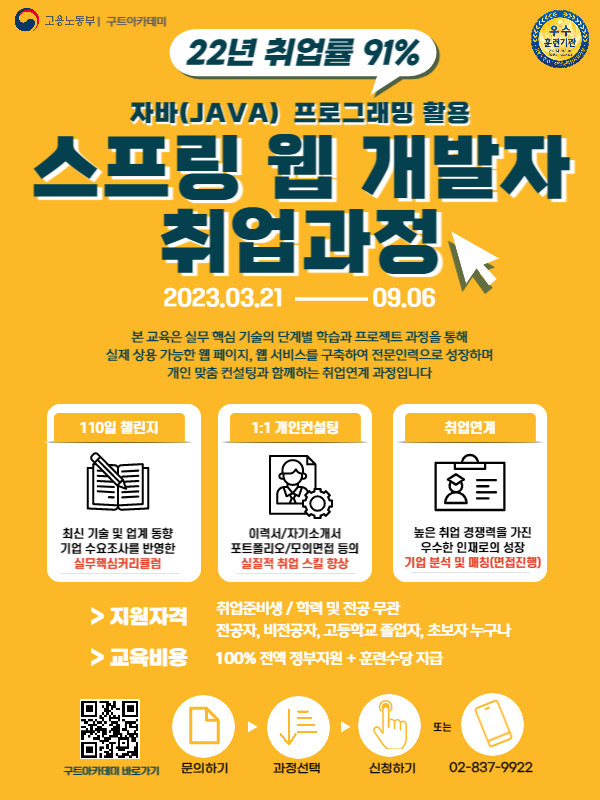 안녕하세요 개발자 전문인력양성 5년인증 우수훈련기관 구트아카데미입니다.