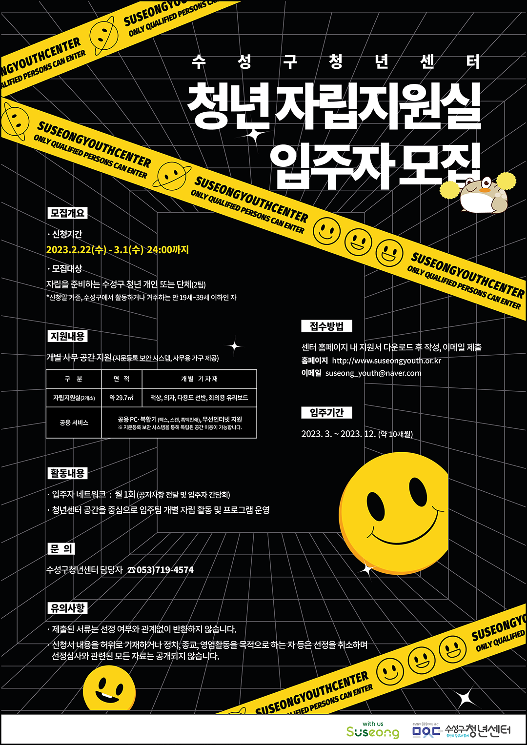 [모집개요] · 신청기간 2023. 2. 22.(수) \~ 3. 1.(수) 24:00 까지 · 모집대상 자립을 준비하는 수성구 청년 개인 또는 단체(2팀) *신청일 기준, 수성구에서 활동하거나 거주하는 만 19세\~39세 이하인 자 [접수방법] 센터 홈페이지 내 지원서 다운로드 후 작성, 이메일 제출 홈페이지 http://suseongyouth.or.kr/ 이메일 suseong_youth@naver.com [입주기간] 2023. 3. \~ 2023. 12.(약 10개월) [활동내용] · 입주자 네트워크 : 월 1회(공지사항 전달 및 입주자 간담회) · 청년센터 공간을 중심으로 입주팀 개별 자립 활동 및 프로그램 운영 [문의] 수성구청년센터 담당자 ☎053)719-4574
