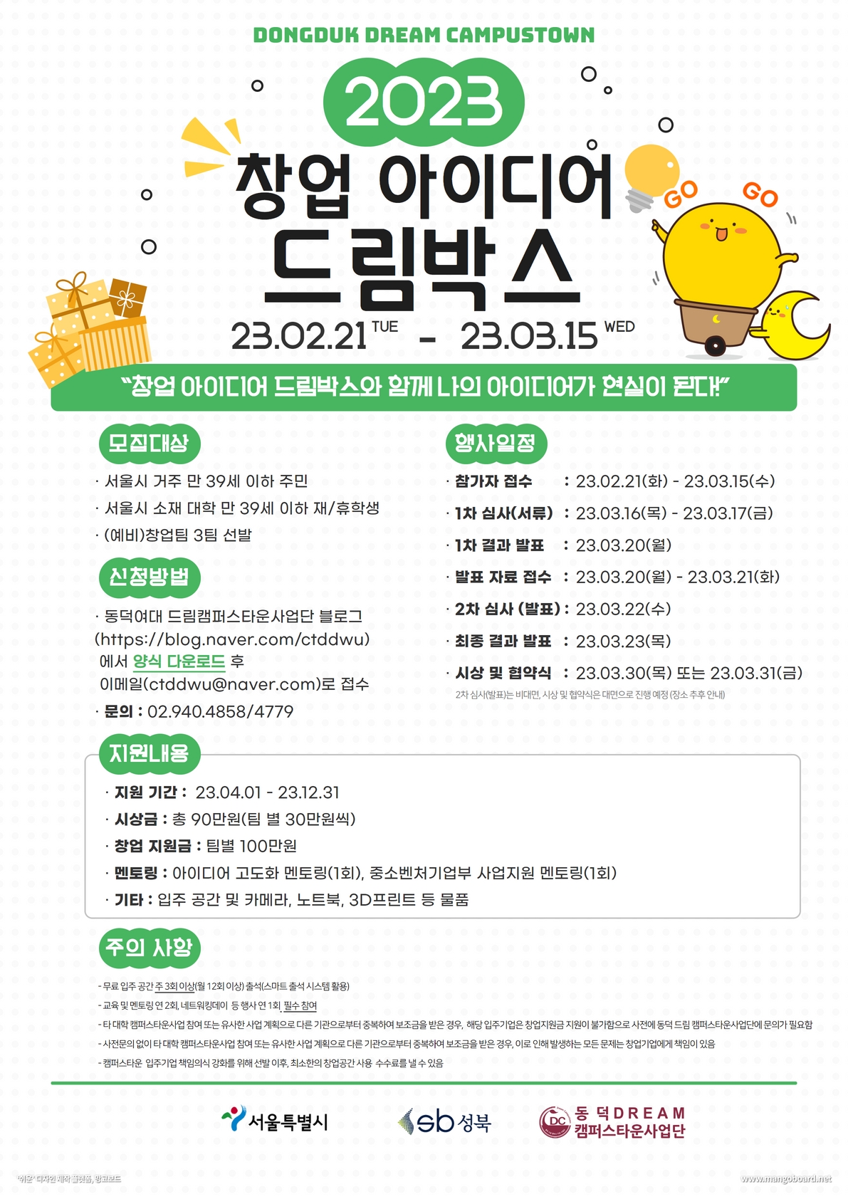 1. 프로그램명 : 2023 창업 아이디어 드림박스 “창업 아이디어 드림박스와 함께 나의 아이디어가 현실이 된다!” 2. 모집대상 : 서울시 거주 만 39세 이하 주민(성북구 거주 우대), 서울시 소재 대학 만 39세 이하 재·휴학생(성북구 지역 대학 우대) 3. 선발인원 : (예비)창업팀 3팀 4. 모집 및 선발 세부 일정