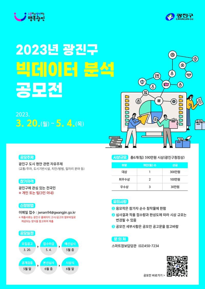 2023년 광진구 빅데이터 분석 공모전 서울특별시 광진구에서는 공공데이터 및 민간데이터를 다방면으로 분석하여 체감도 높은 정책 아이디어를 발굴하고, 데이터 분석에 기반을 두어 공익적 아이디어를 제안하는 문화를 확산하기 위해, ‘2023년 광진구 빅데이터 분석 공모전’을 다음과 같이 개최하니 많은 참여 바랍니다. 2023년 2월 16일