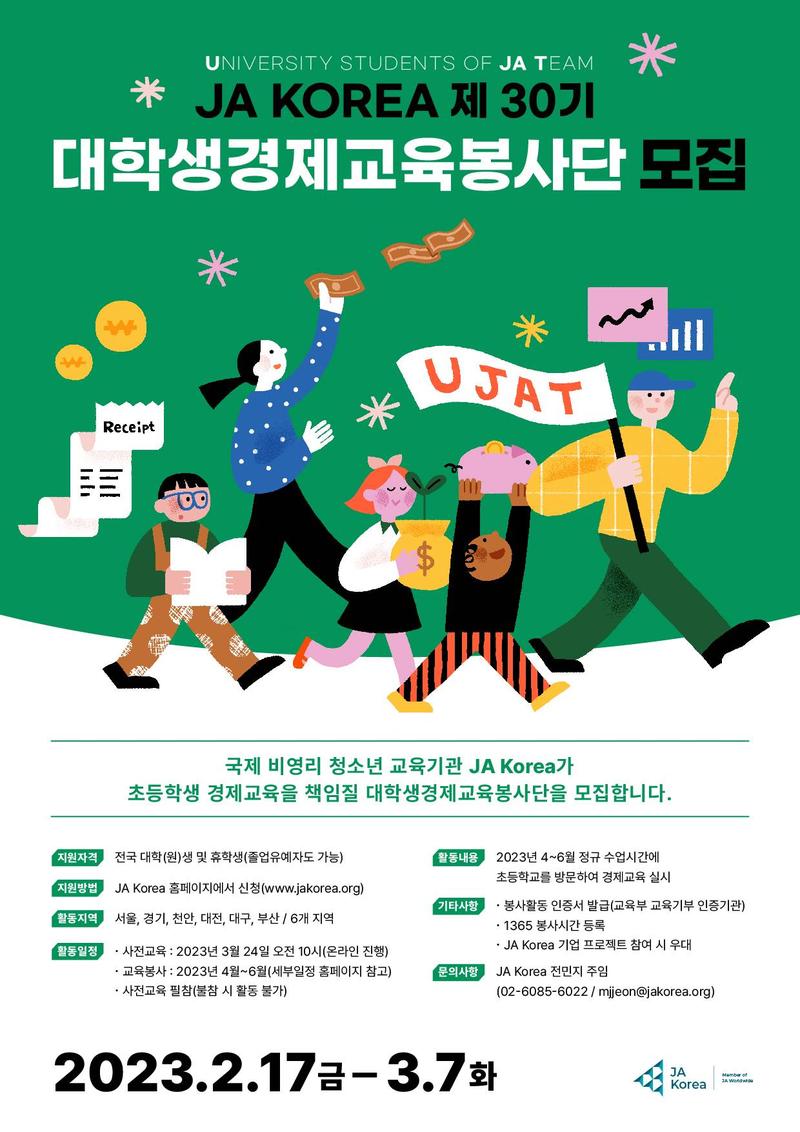 2. 지원자격 - 교육봉사에 성실한 자세와 책임감을 갖고 참여를 원하는 전국 대학(원)생 - 휴학생 및 졸업유예자도 가능 3. 지원방법 - JA Korea 홈페이지 신청(www.jakorea.org)