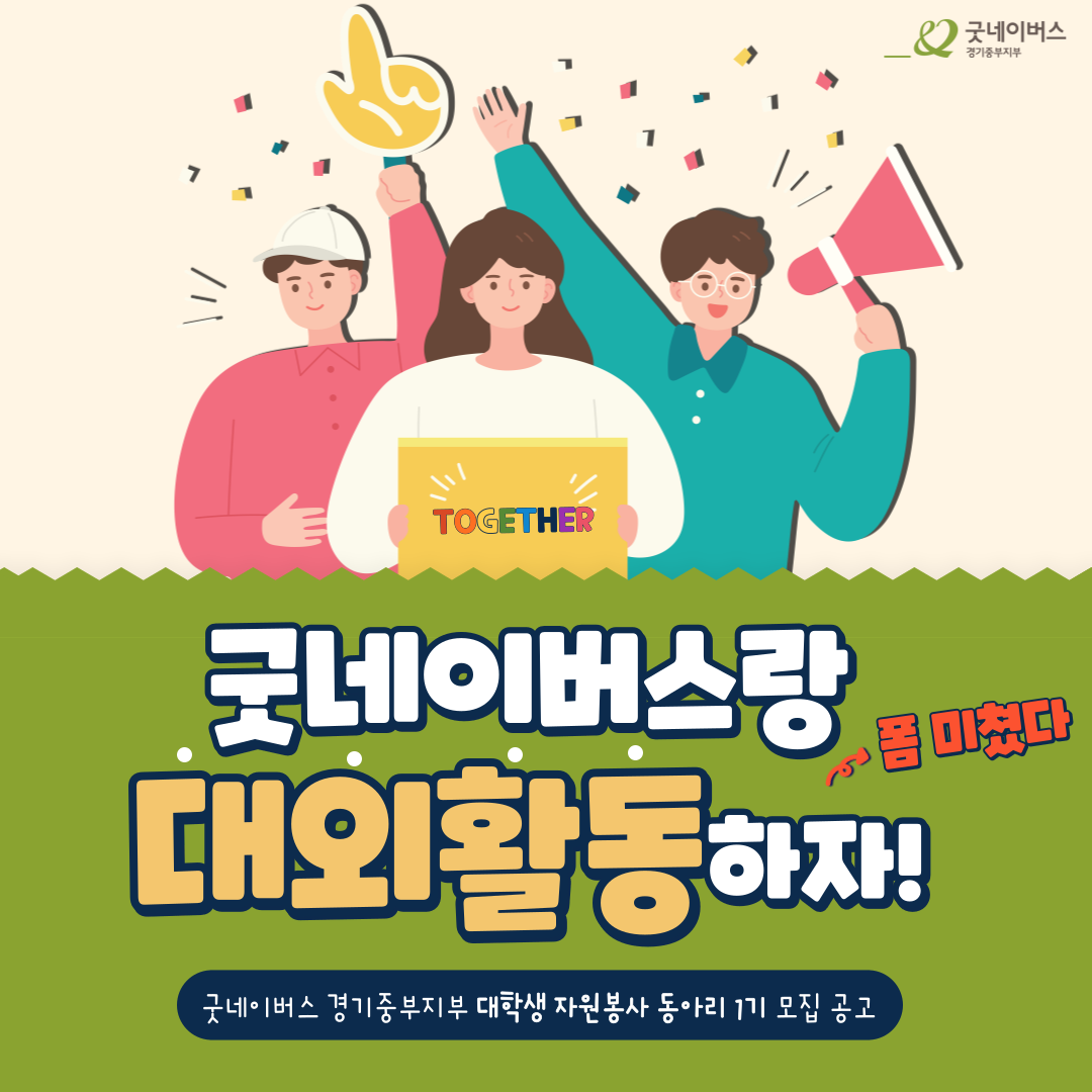 어린이가 행복한 세상을 만들기 위해 [굿네이버스 경기중부지부 대학생 자원봉사 동아리 1기] 동아리원을 아래와 같이 모집하니 따뜻한 마음과 열정이 가득한 대학생들의 많은 관심과 참여바랍니다.