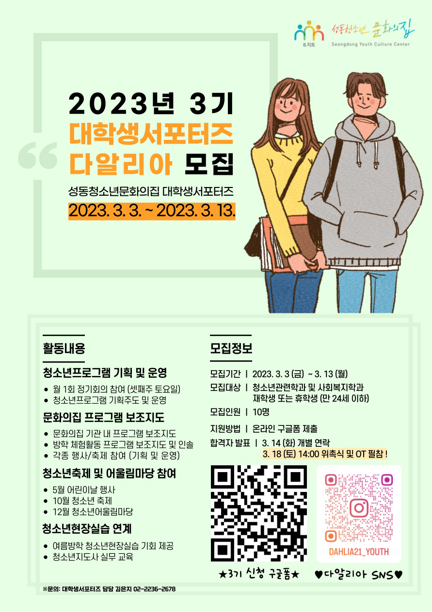 ☎ 문의 : 성동청소년문화의집 대학생 서포터즈 담당 김은지 02-2236-2678