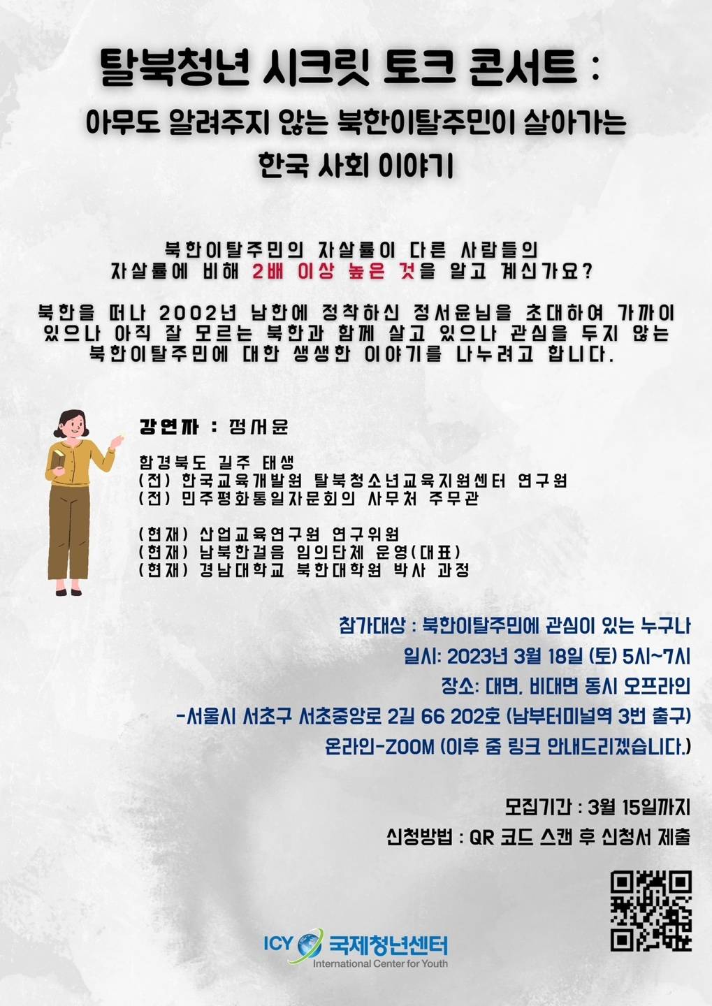 우리는 얼마나 정확하게 북한을 바라보고 있을까? 북한이탈주민은 과연 통일이 될거라고 생각할까? 북한이탈주민에게 관심을 가져야 할 필요가 있을까? 통일이 되면 과연 한국은 잘 살까? 내 삶은 더 나아질까? 내가 정말 듣고 싶은 이야기를 들을 수 있는 탈북청년과 함께 하는 솔직담백한 토크 콘서트에 초대합니다.