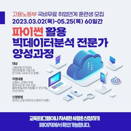 교육일정 : 23년 3월 2일(목) \~ 23년 5월 25일(목) 09:00\~17:40 (월\~금) 총60일 480시간